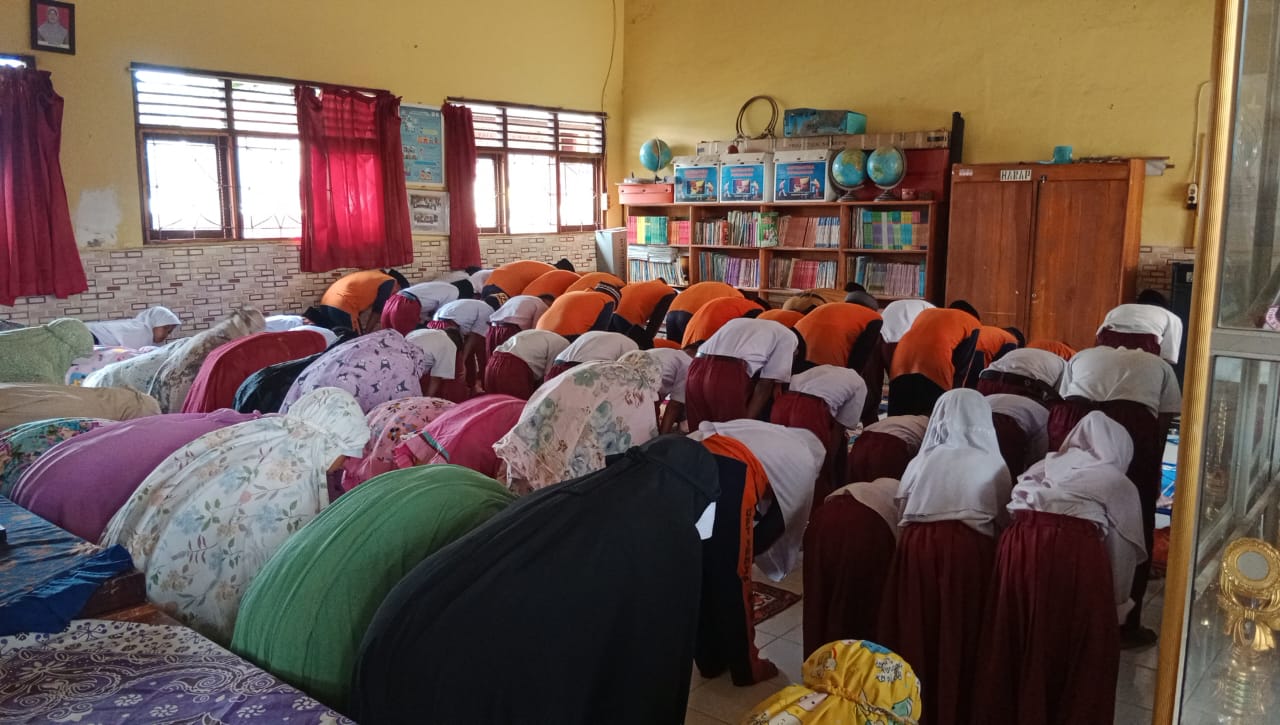 Para siswa tampak antusias mengikuti kegiatan ini. Dengan mengenakan mukena dan alat sholat lainnya yang telah disiapkan dari rumah, mereka dengan tertib mengikuti setiap gerakan sholat dan mendengarkan pengarahan singkat dari guru seusai ibadah.